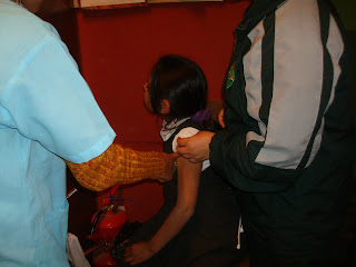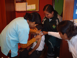 Se realizó en nuestro colegio la tercera dosis de vacunación contra la Epatitis B, con el apoyo del Centro de salud de nuestra comunidad. en la foto las enfermeras con la Directora Isabel agradeciendole por las facilidades brindadas para con la campaña.