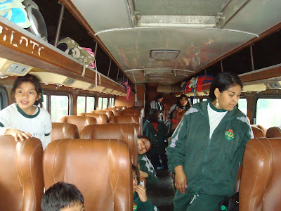 En el autobus las profesoras acomodando a los niños.