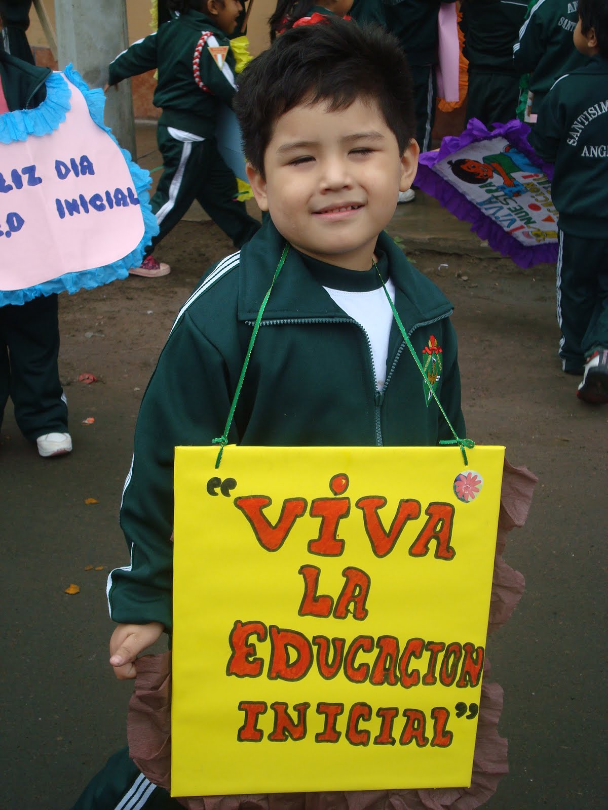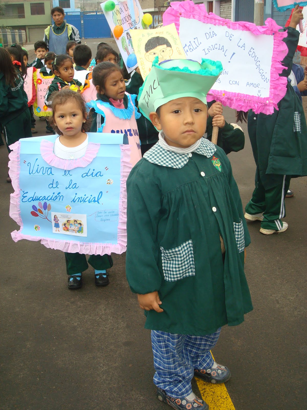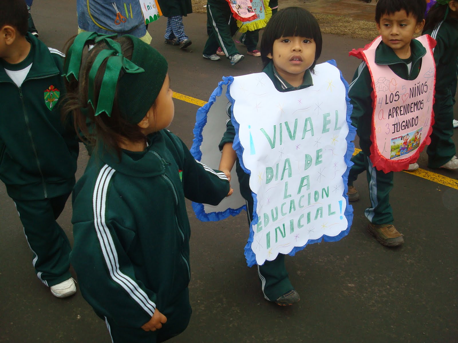 desfilando con pancartas por el día de la educación inicial.