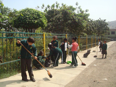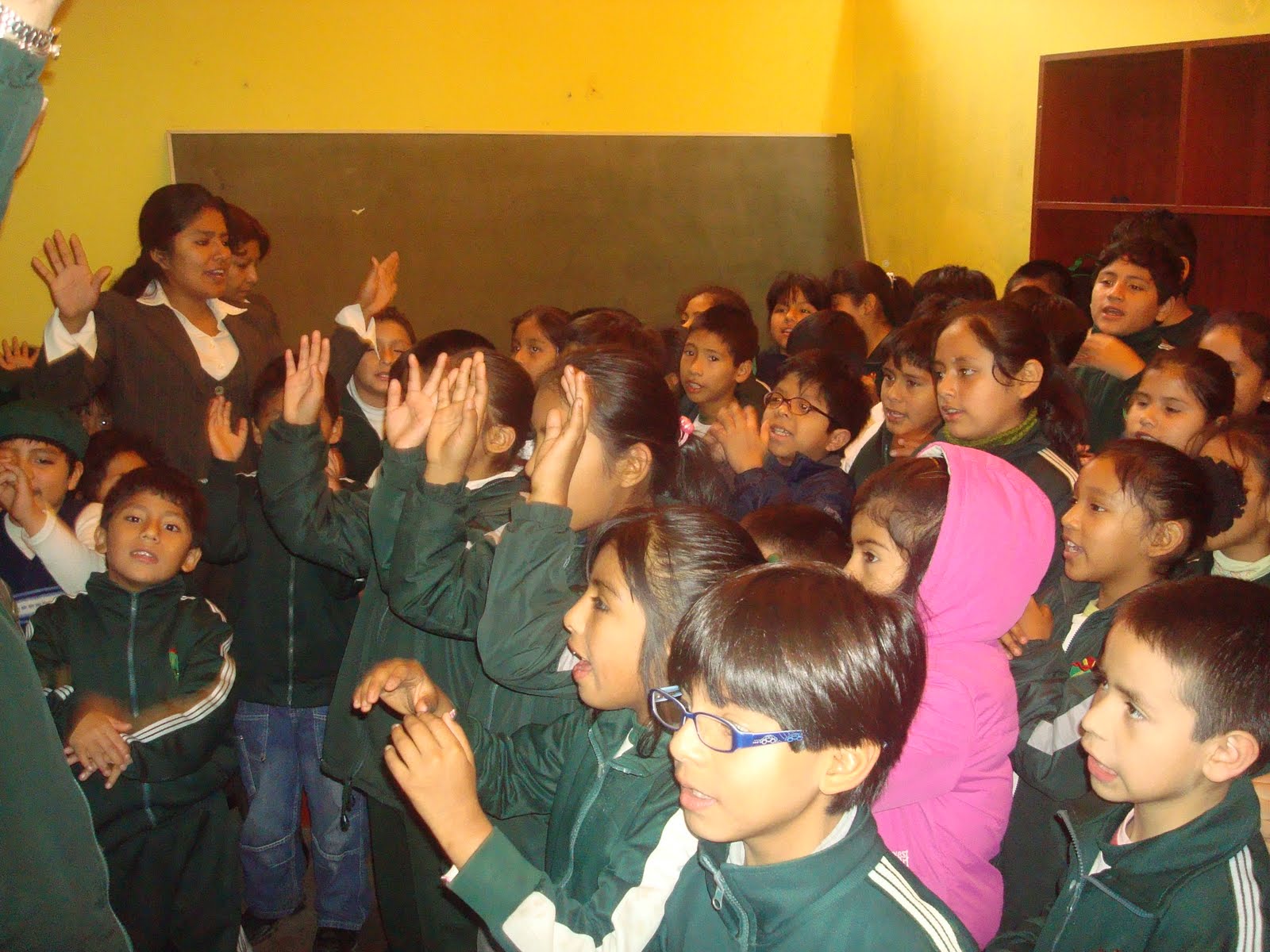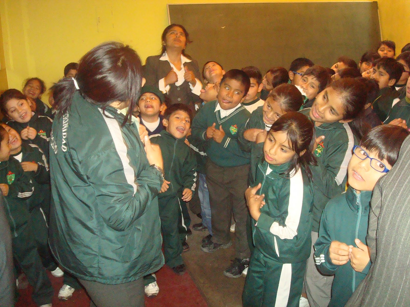 Alumnos y Directora organizamos un homenaje sorpresa para nuestras maestras de la santísima Trinidad antes de iniciar las clases. Alumnos saludando a Miss Nancy.